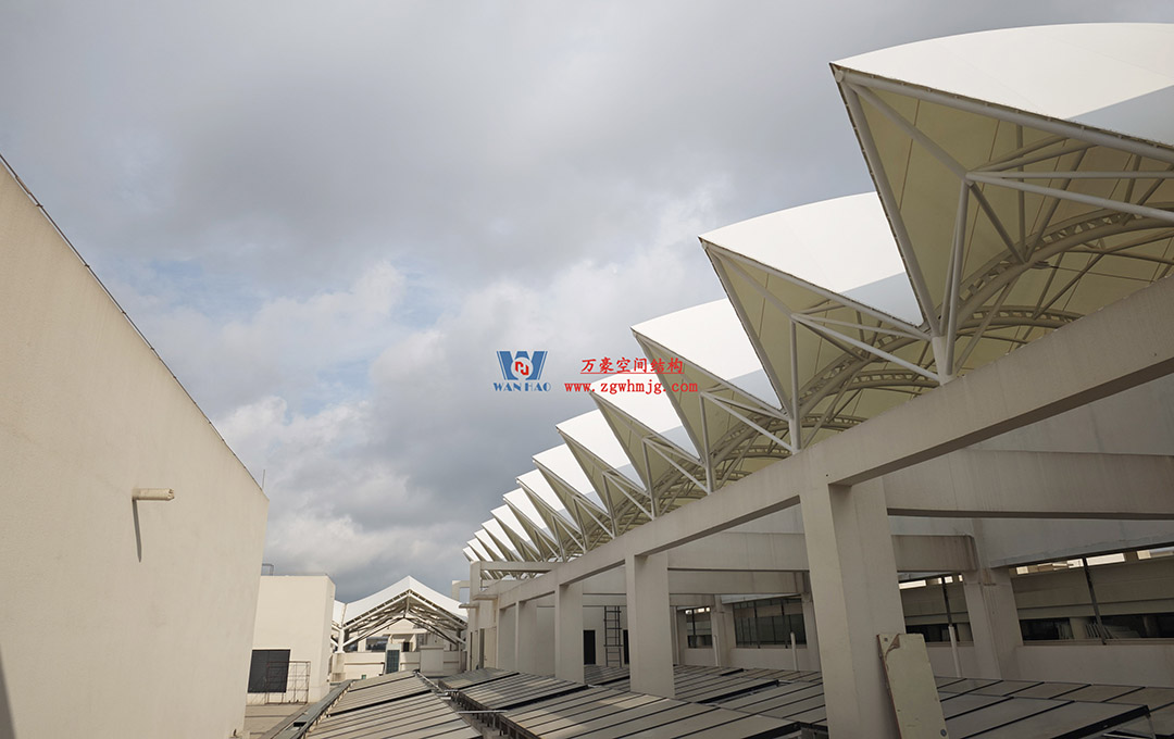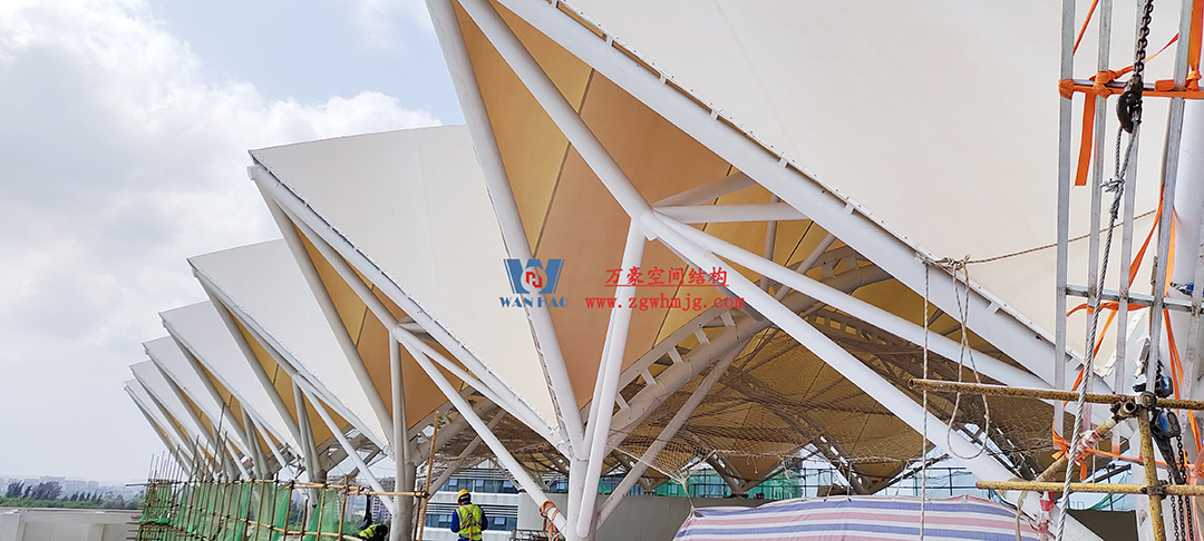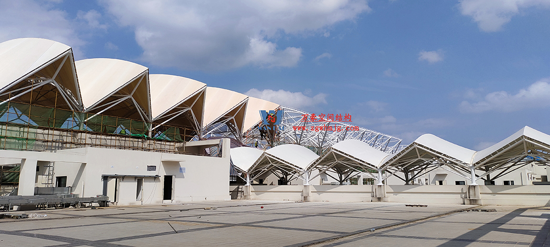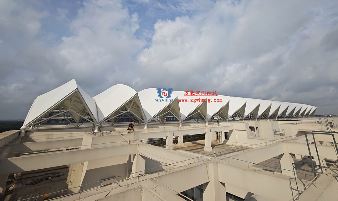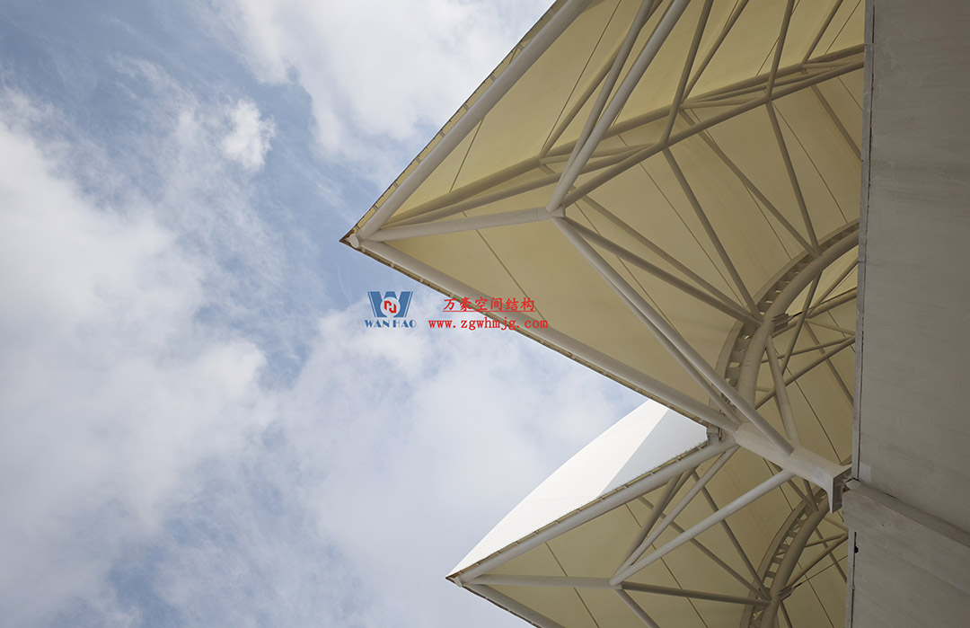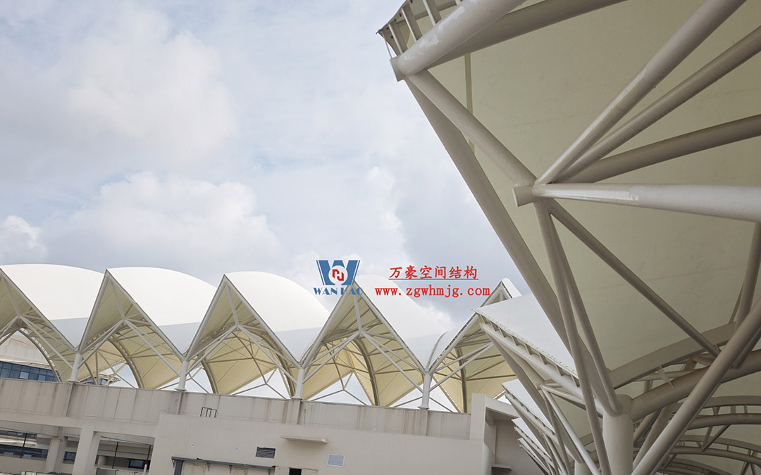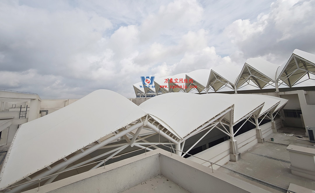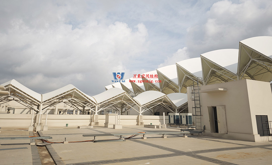 海南醫學院第一附屬醫院江東新院區膜結構工程,該項目用鋼量約360噸,PTFE膜結構展開面積約4500平米。