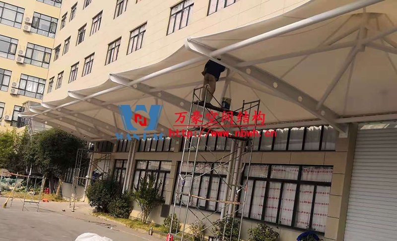 寧波中天家居膜結構雨棚工程位于浙江省寧波市寧海縣,由寧波萬豪空間結構工程有限公司承建。
