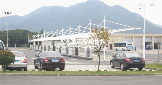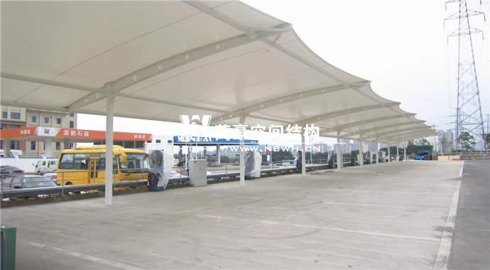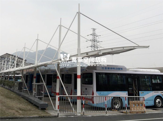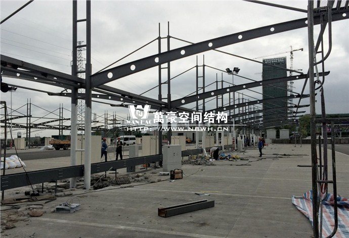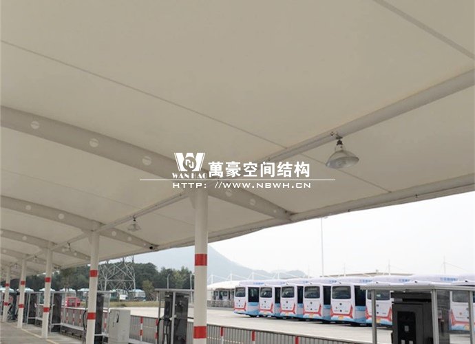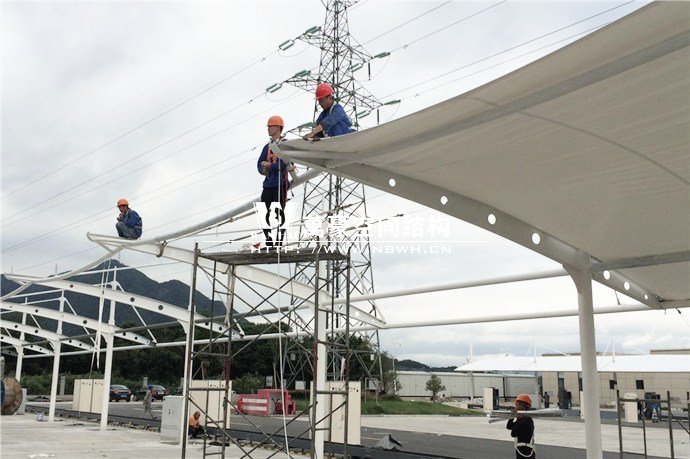 膜結(jié)構(gòu)雨棚施工面積約5138平方;用鋼量約80噸。施工難點在于工期緊。施工時天氣情況差,連續(xù)的陰雨天給鋼構(gòu)的油漆施工帶來了極大的麻煩并且延誤了工期。雨棚底下還要安裝充電樁,我們還要和充電樁施工班組進(jìn)行技術(shù)對接,規(guī)劃充電樁的安裝位置。由于工期緊,天氣狀況差,我們動用了兩個施工班組加班加點,土建、鋼構(gòu)交叉施工,最后如期完工。由于每個雨棚長度比較長,施工班組在立好鋼構(gòu)件之后從中間開始往兩邊安裝膜布,使工作效率有了很大的提高。