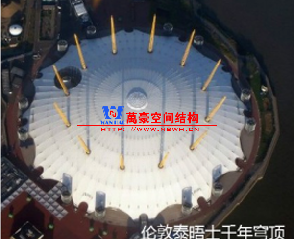 千年穹頂1999年底建成,其造型很奇特,它有12根穿出屋面高達100米的桅桿,屋蓋采用圓球形的張拉膜結(jié)構(gòu)。膜面支承在72根幅射狀的鋼索上,遠遠望去像一個白色的大帳篷。