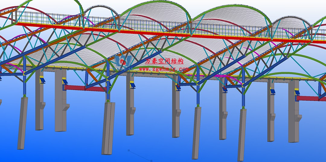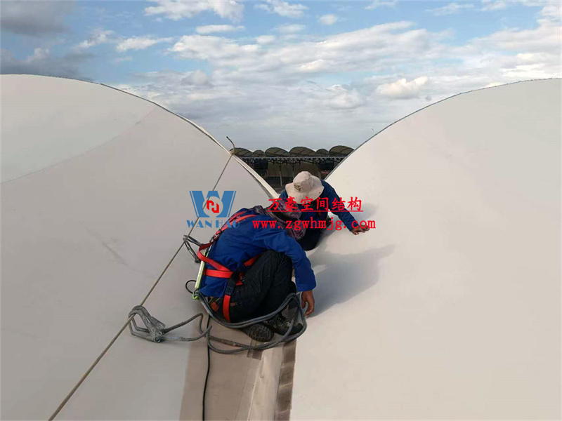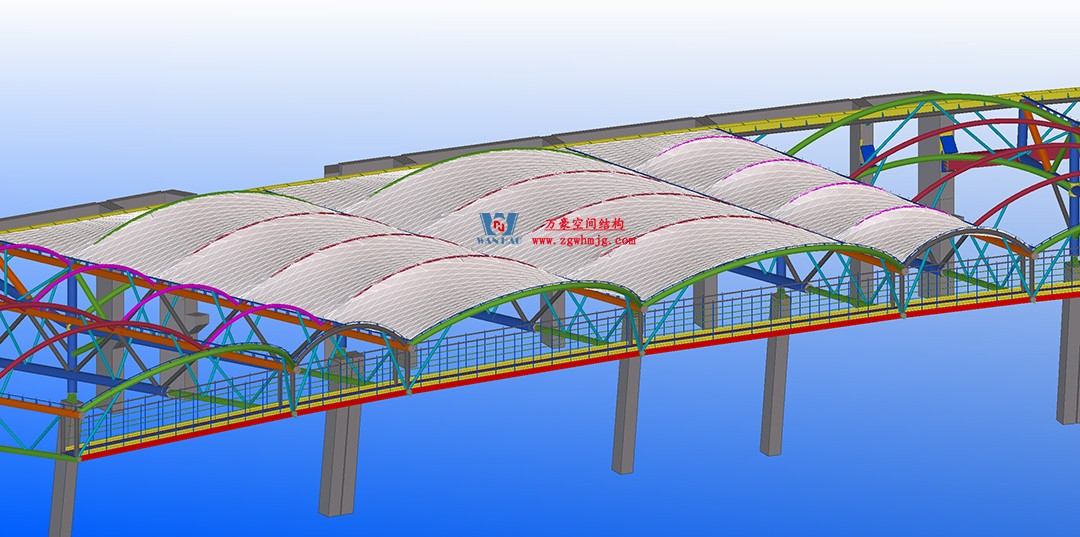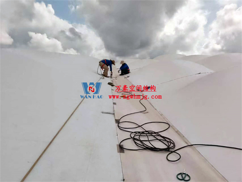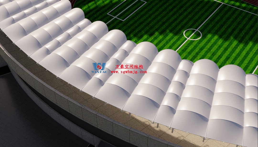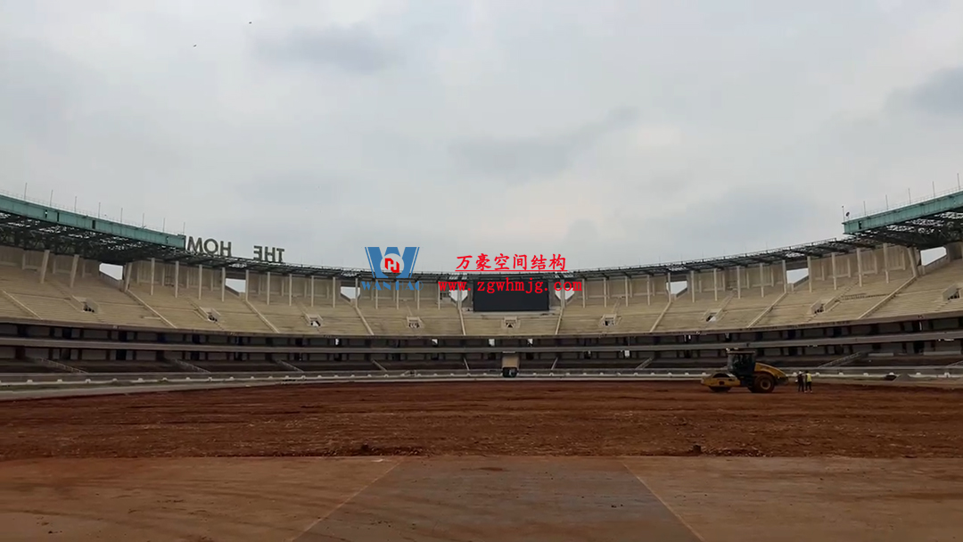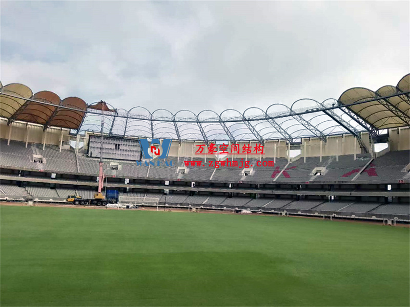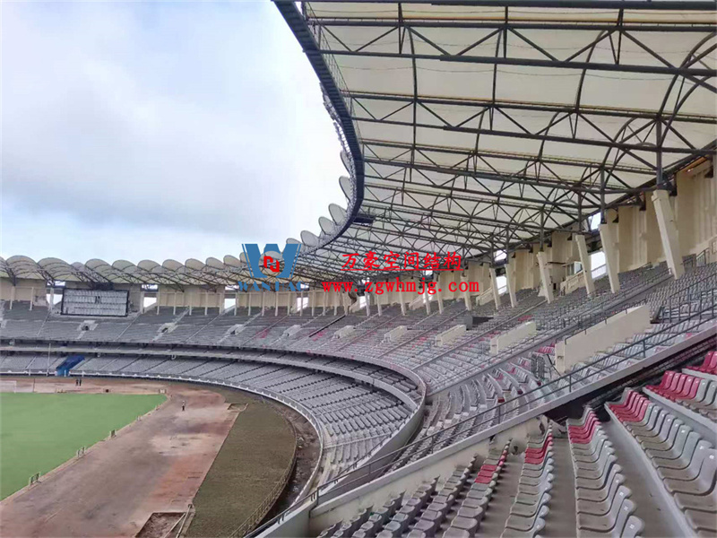 容納3萬人肯尼亞內羅畢(非洲杯)足球體育場,屬于整體性改擴建項目,因體育場投入使用30余年,原設施落后陳舊,改造設計要求充分考慮原基礎結構安全。項目前期需要進行基礎立柱定位,結構屋面拆除等相關工作,并通過科學有效的技術措施處理,3D掃描,健康檢測,建模分析等,經過多輪方案比選后,最終選擇PTFE膜屋面大懸挑空間結構。主體桁架懸挑45米,橫向聯系向上起拱,屋面采用高自潔PTFE膜結構,開口式體育場內部視野空曠無遮擋,讓非洲人民足球夢想在這里展翅高飛。該項目作為2026年非洲杯足球賽體育場之一投入使用,改擴建設計生產施工全部由萬豪團隊完成,充分體現了萬豪的設計施工服務能力,也為海外市場的拓展奠定了扎實的基礎。
