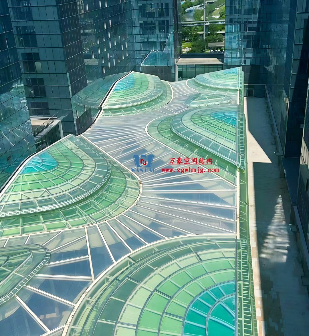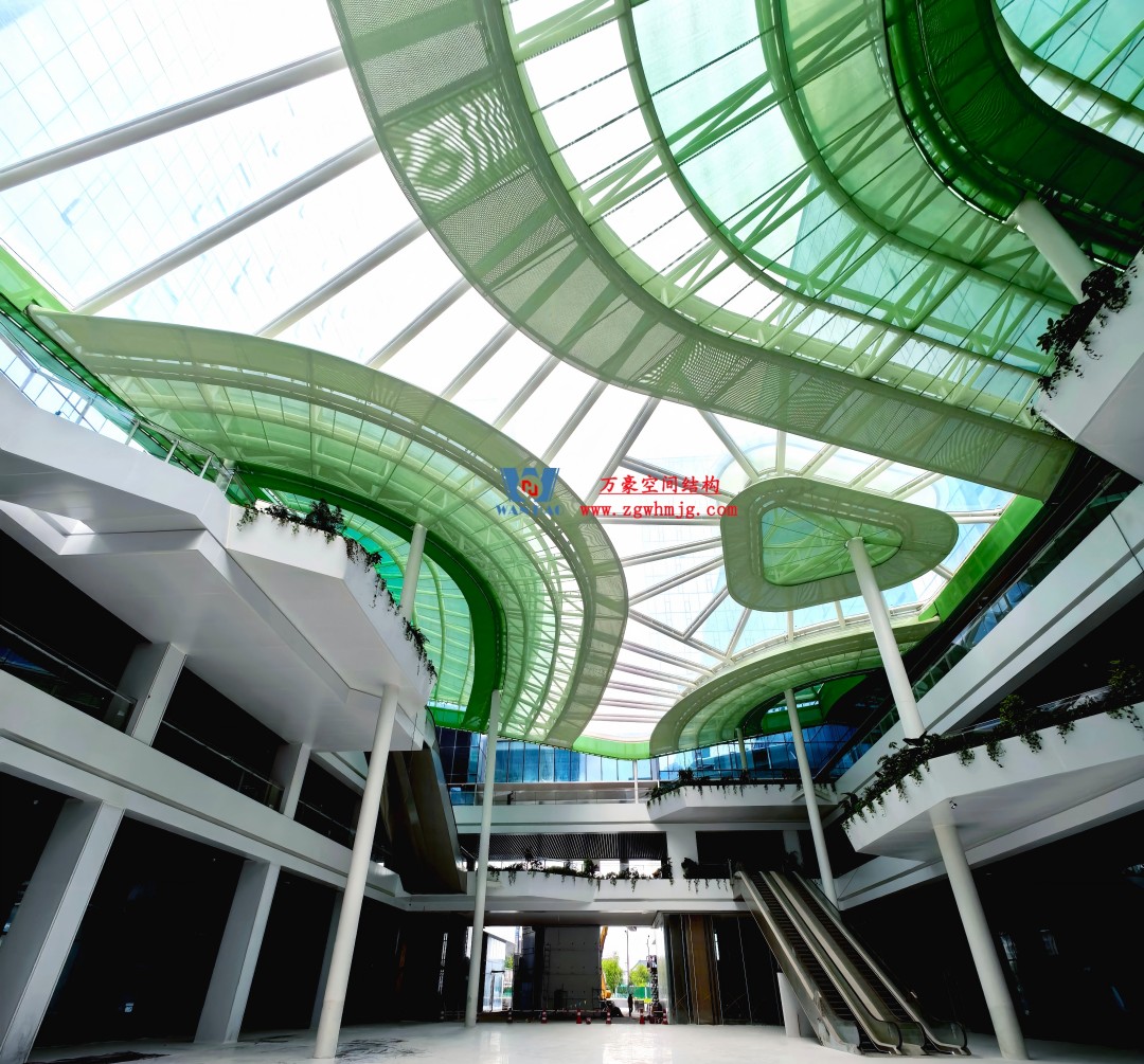 “茶山”賦予了園區使用者平等的視覺權利:天幕遮蔽了高聳的塔樓,在內部感受到的中庭不再是狹窄壓抑的“天井”;四層以上面向中庭的辦公人群同樣獲得了宜人的視覺觀感,有如俯瞰碧綠的茶田。 中庭天幕的造型設計復雜而精細。改造設計開始時項目已基本竣工,中庭的支撐結構因此只能落在地下室的頂板上。為在有限的冗余荷載范圍內實現設想,設計師選擇了輕質的膜材料配合鋼結構框架構建天幕,其所需的結構加固程度小于玻璃等傳統材料,可塑性強,并可以借助雨水沖刷完成自清潔,降低了日常維護成本。 從空中俯視,天幕的膜材料為兩部分,強透光性的白色氣枕近似透明,將柔和的光影投射在中庭內部;綠色的多層膜結構則比擬茶山。如同張開的“陽傘”,以近似梯田的方式切分,層次間的空隙改善了中庭的通風與排煙性能。
