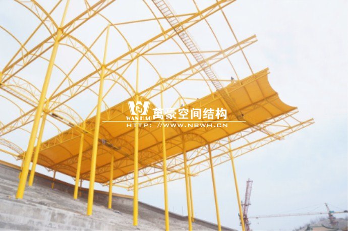 橫店影視城被一圈連綿起伏的山巒包圍著,層疊的遠(yuǎn)山宛如水墨畫。圓明新園則位于小鎮(zhèn)西邊的山巒中,芳草萋萋、溪水潺潺!花仙湖膜結(jié)構(gòu)看臺坐落于圓明新園春苑東北角,為骨架支撐式膜結(jié)構(gòu),建筑面積約為16000㎡,看臺主體結(jié)構(gòu)可分為15個單元,屋面膜結(jié)構(gòu)則由30片膜組成。主體結(jié)構(gòu)劃分為四大部分:鋼柱、主桁架、次桁架和馬道。鋼柱高34.76米,單個重量達(dá)8.2噸;主桁架長70.66米,柱間距15米,看臺屋面猶如浮動的金色流云,徜徉在花仙湖上空。此項目為全國最大的“水戲”表演建筑的看臺,同時也是水上樂園彩色膜結(jié)構(gòu)最大的一個景觀。